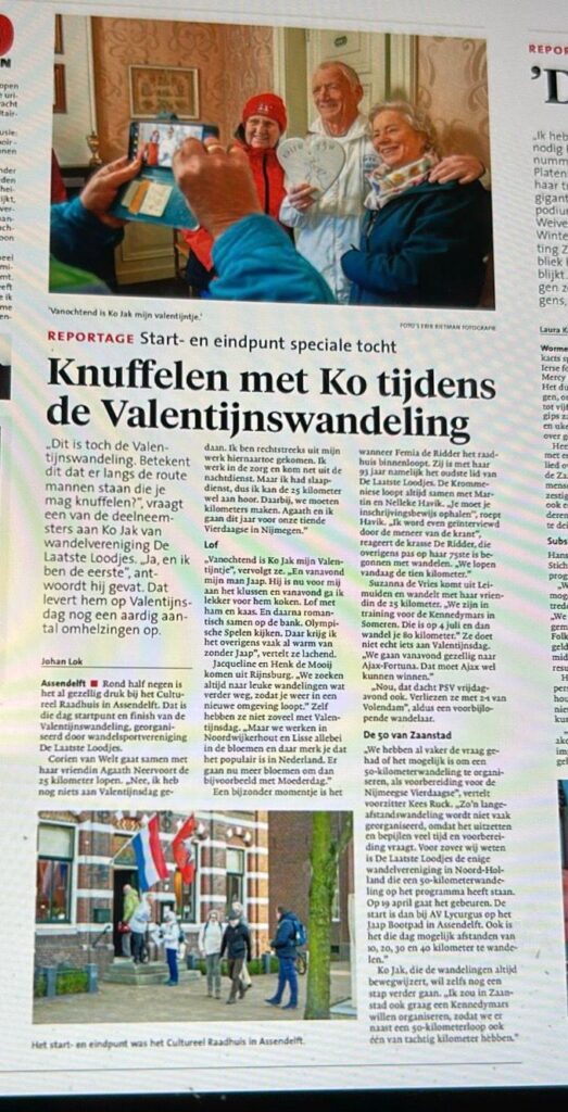 De eerstkomende wandeling is de Valentijnstocht op zaterdag 14 februari a.s. met start en finish bij het Cultureel Raadhuis in Assendelft,